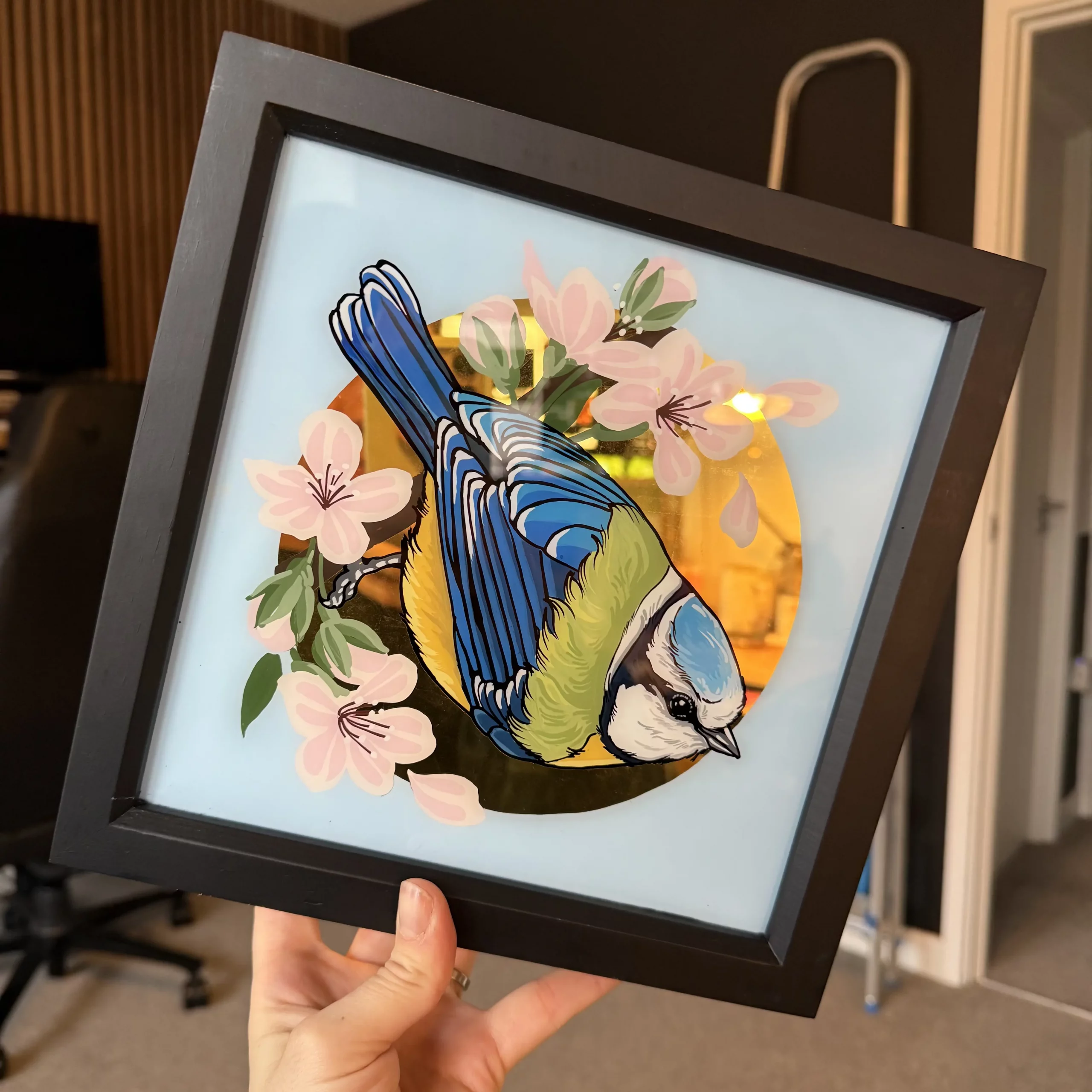 Reverse Glass hand-painted framed sign featuring a Blue Tit amongst blossom with genuine 23 Carat Gold