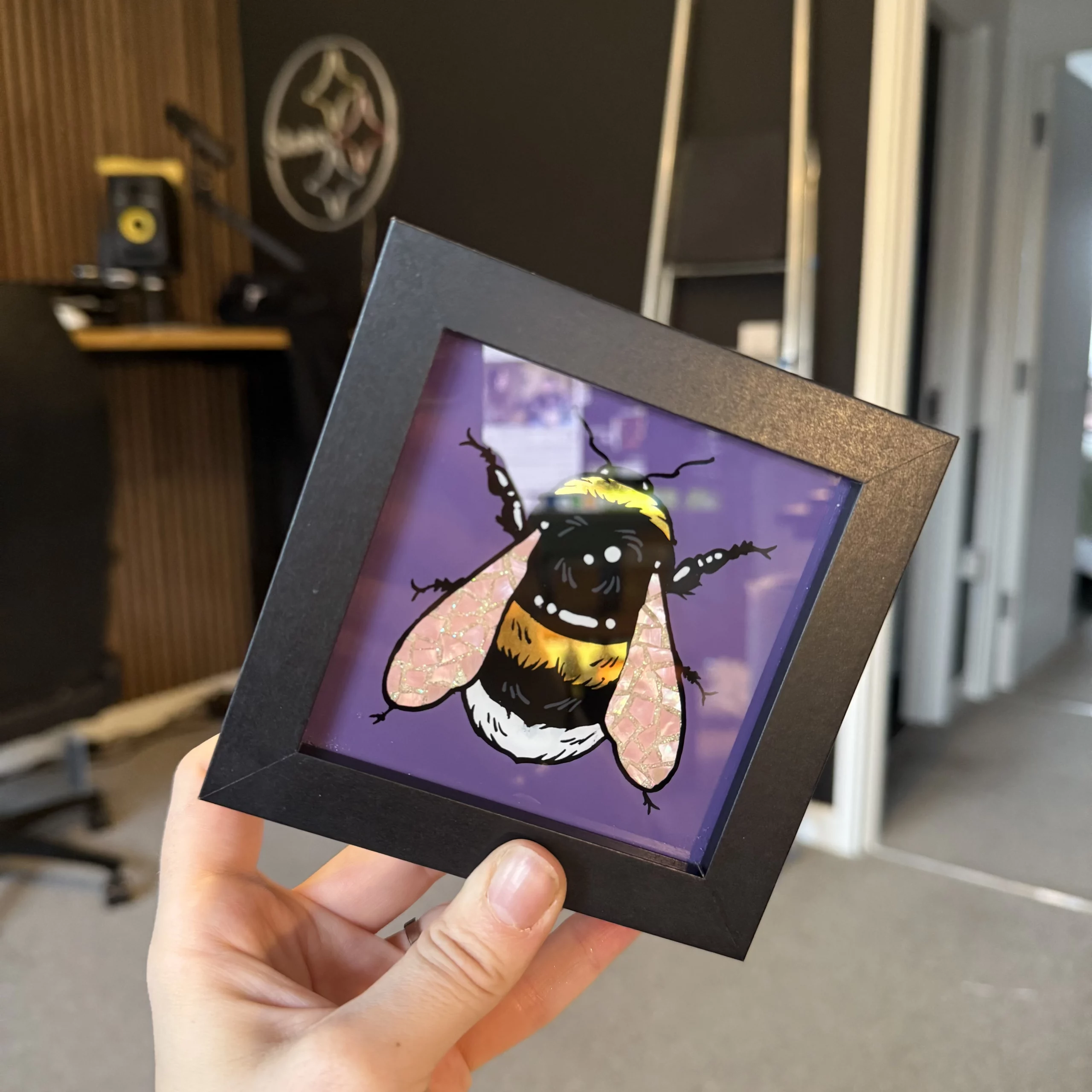 Reverse Glass hand-painted bumblee frame with genuine 23 Carat Gold and abalone shell/glitter wings.