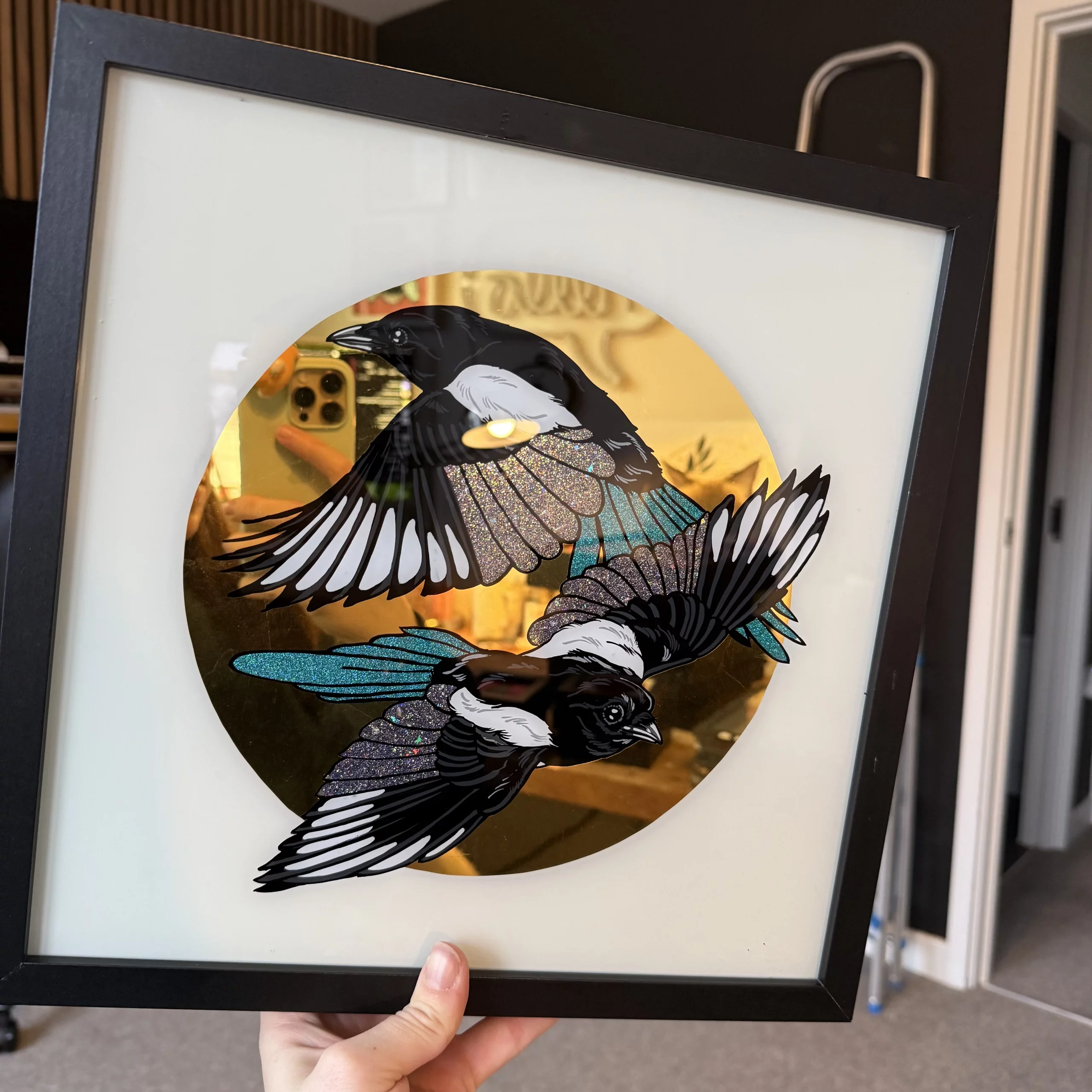 Reverse Glass hand-painted framed sign featuring two magpies in flight with irridescent glitter wings and gilded with genuine 23 Carat Gold