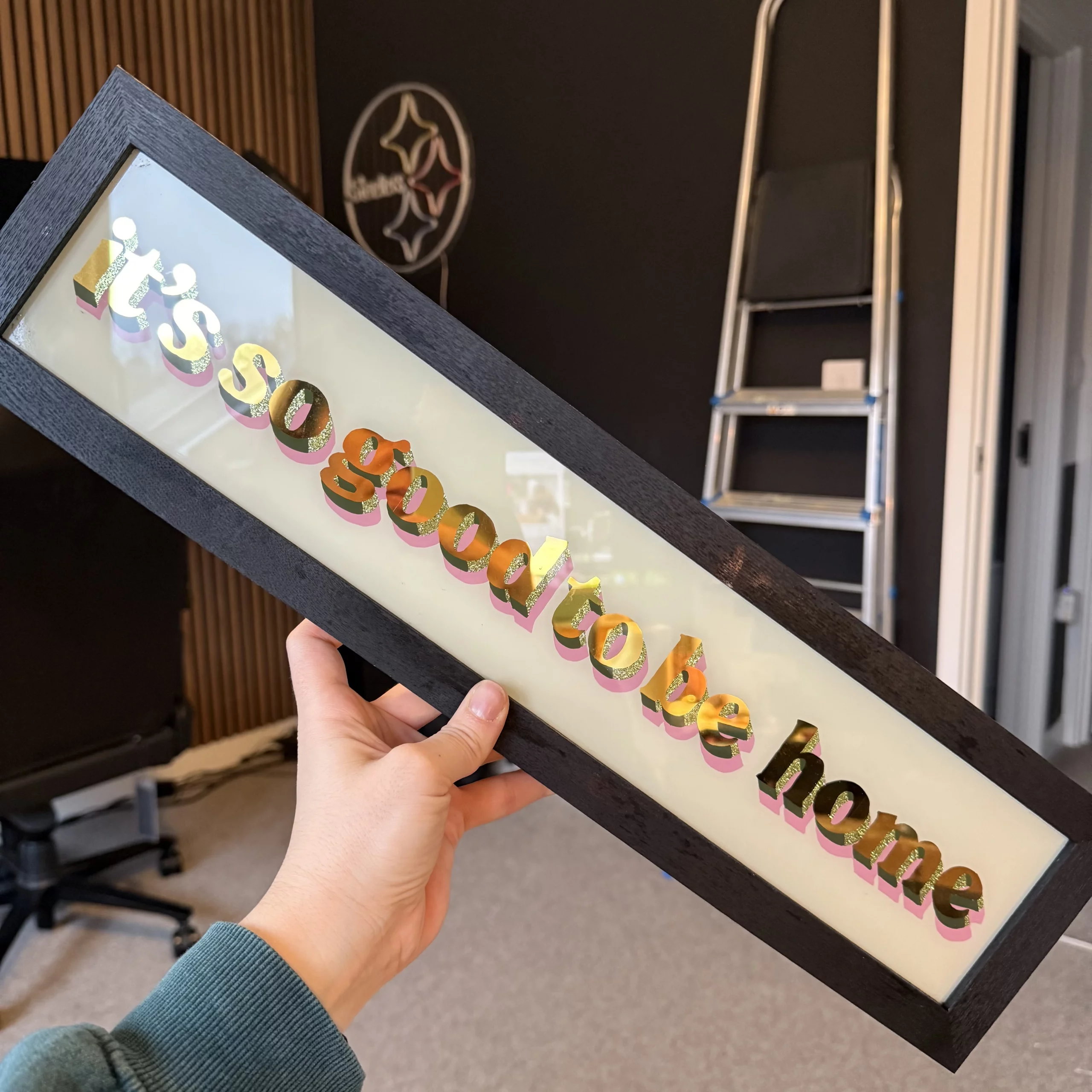 Reverse Glass hand-painted ‘it’s so good to be home’ sign with genuine 23 Carat Gold glitter details.